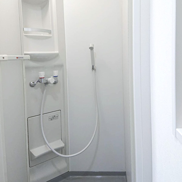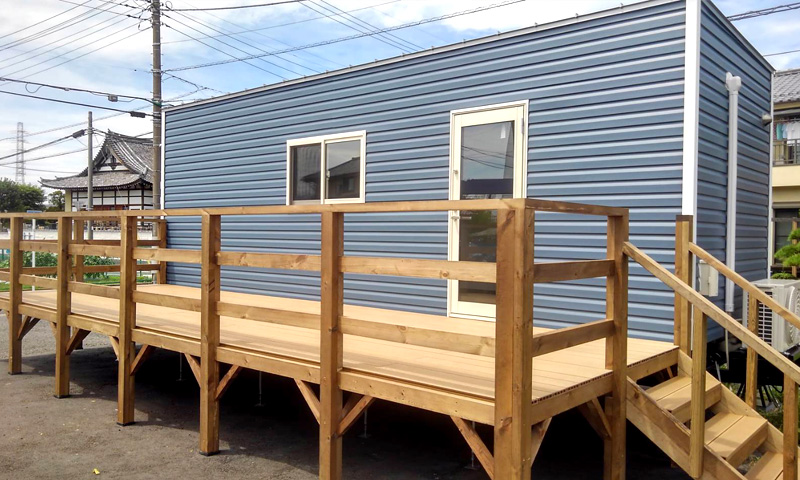 レガッタブルーの鮮やかさとウッドデッキが映える1台。シンクやシャワールームを設置し、充実の性能で、休憩所として快適にお使いいただけるようこだわってお作りしました。